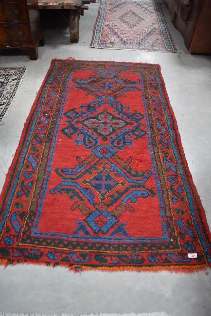 A Turkish Ushak style rug having bright red ground and multicoloured pattern, approx. 179 x 94cm
