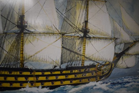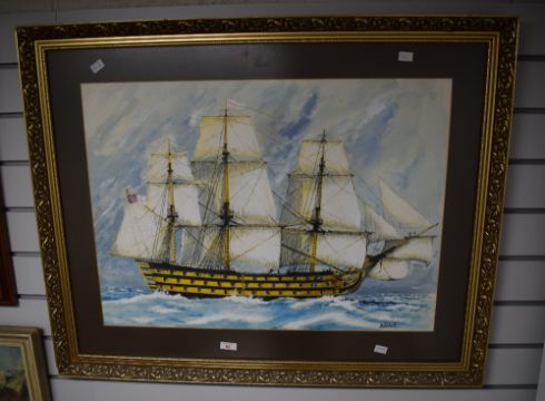 D Pollock (British Contemporary) Watercolour on paper, possibly a depiction of the royal naval ship the H.M.S Victory, signed to lower right, within card mount and moulded gilt frame, under glass 51.5cm x 71cm & 75cm x 94cm overall.