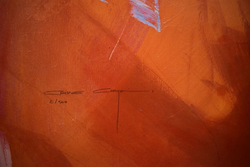 After Christine Comyn (Belgian 1957) Embellished print on canvas 'To the Ball', an expressive depiction of a lady dancing in a red dress, signed and numbered (2/100) to lower left, within cream slip and gilt frame, 85cm x 100cm & 103cm x 118.5cm overall.