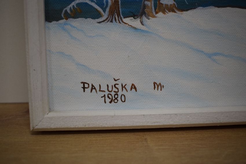 Martin Paluska (Serbian 1913 - 1984) oil on canvas, a winter scene with villagers dressed in traditional clothing playing instruments riding on a horse drawn sleigh, signed and dated (1980) to lower left, within white tray frame, 69cm x 39cm & 71cm x 41cm overall. *Paluska regularly painted his home town of Kovacica creating pieces that focused on the world of villagers , fieldwork and customs including everyday displays of folk costumes, he believed in using art as a way to preserve and record tradition for future generations.