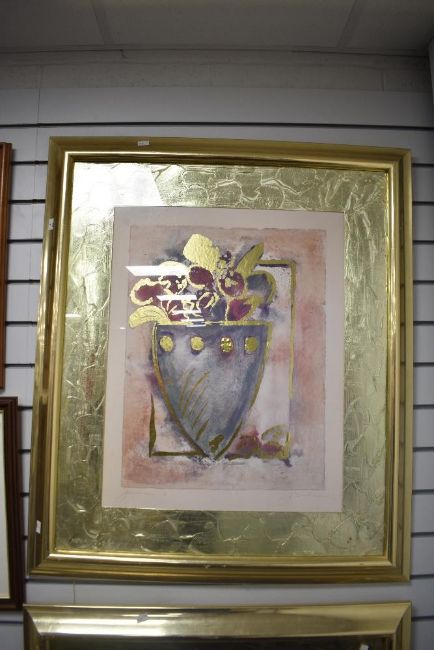 After Joyce Combs (American 1933-2023) a pair of large gilt embellished colour prints 'Jardinere I' & 'Jardinere II' each entitled and signed in pencil to margin, within a broad textured metallic mount and moulded gilt frame, under glass