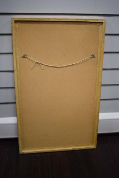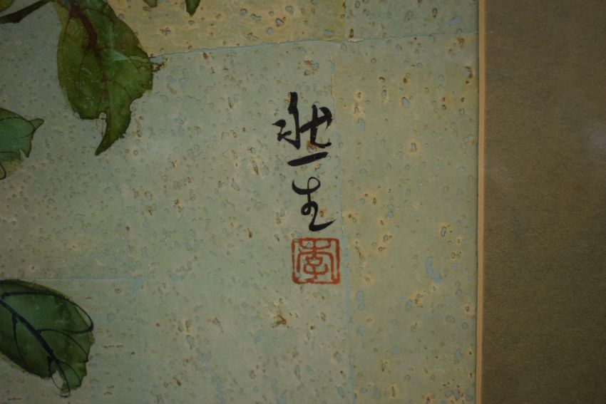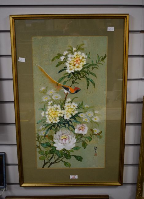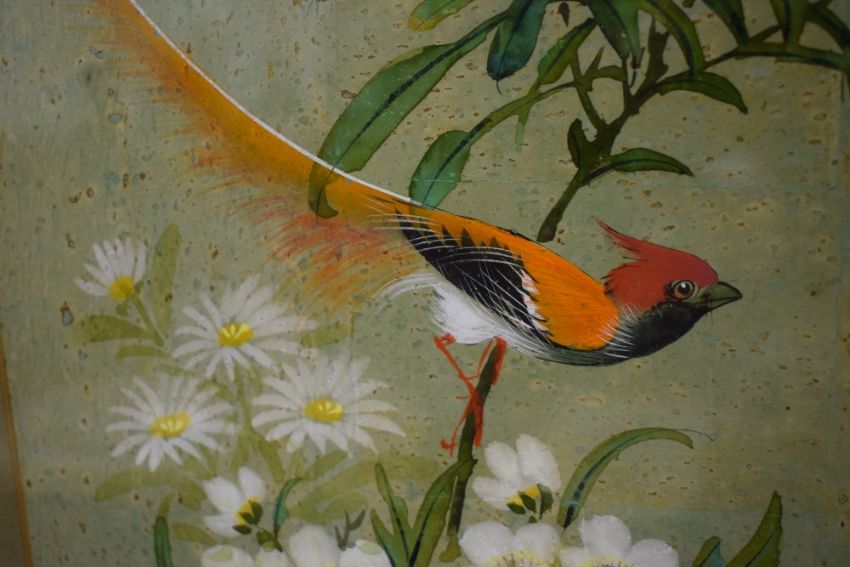 A 20th Century Chinese Gouache on cork paper, depicting an orange feathered bird and florals, signed to lower right, within card mount and moulded gilt frame, under glass 30cm x 58cm & 47cm x 76cm overall.