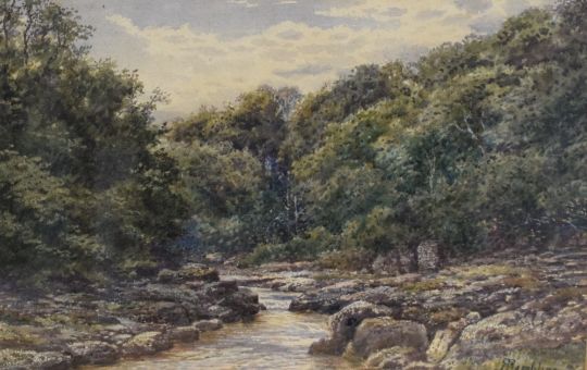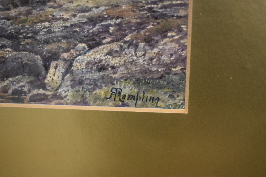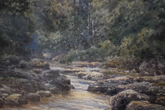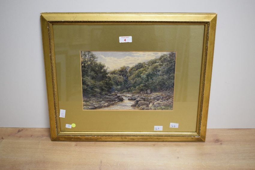 Robert Rampling (British 1836-1909) watercolour, rocky edged stream scene, signed lower right, within a broad gilt card mount and moulded gilt frame, under glass 18cm x 27cm & 40.5cm x 49cm overall.
