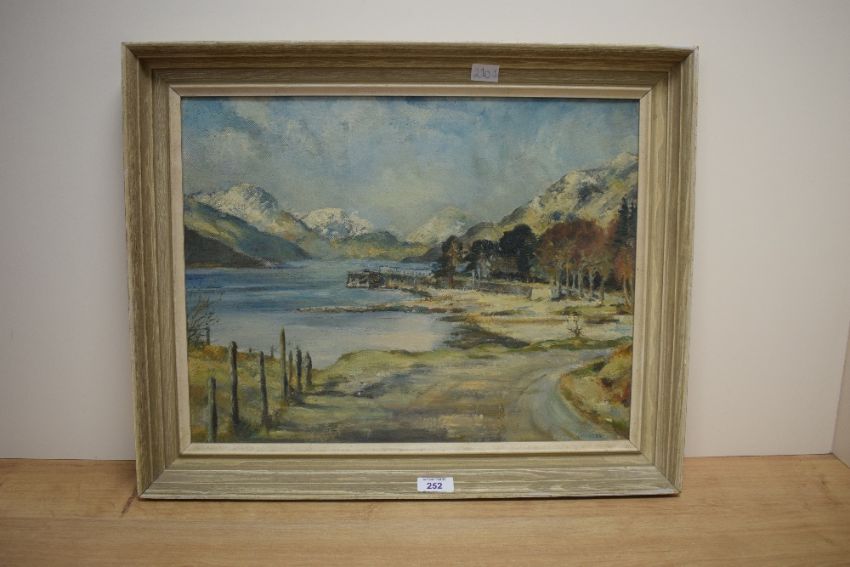 Gourley (20th Century) oil on board 'Loch Lomond from Rowardennan', an impressionistic winter landscape from the shore, signed lower right and titled verso, within grey moulded frame, 44cm x 34cm & 53.5cm x 43.5cm overall. Some aging to board. *Possibly the work of Alan Stenhouse Gourley (Scottish 1909-1991), however the signature is a printed name rather than his usual expressive sign.