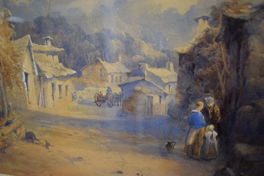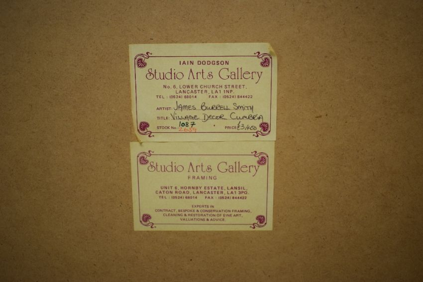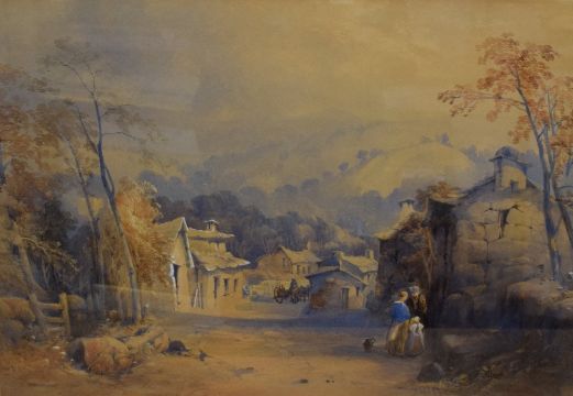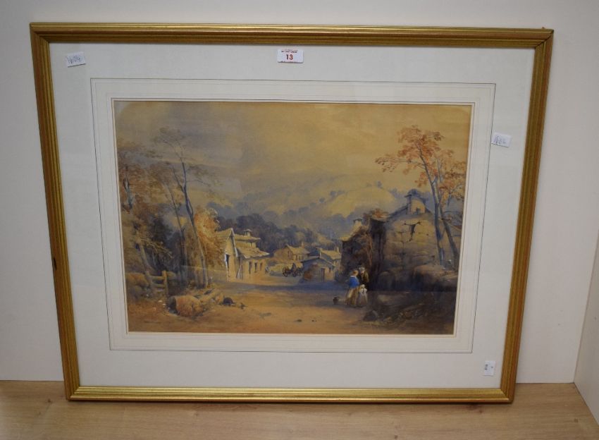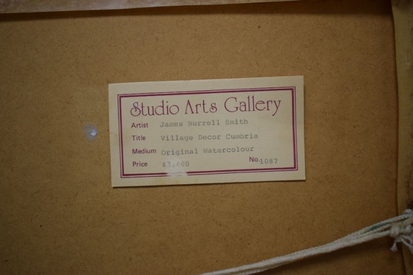 James Burrell Smith (British 1822-1897) English School Watercolour 'Village Decor Cumbria', a 19th century street scene showcasing typical cumbrian stone houses and villagers beneath the fells, signed and dated (1849) to lower left, titled and attributed verso, within washline mount and moulded gilt frame, under glass 51cm x 36cm & 73cm x 59cm overall. Some discolouration.