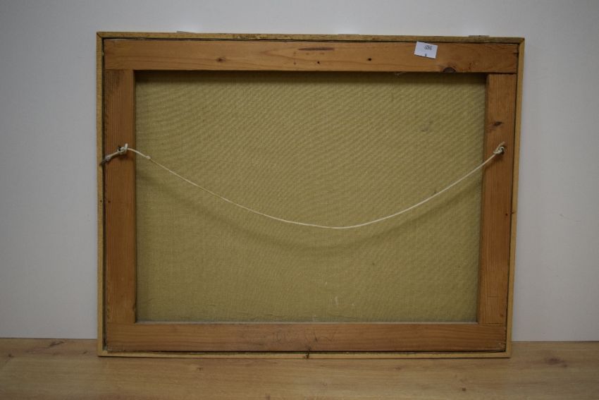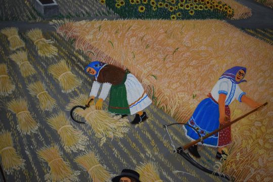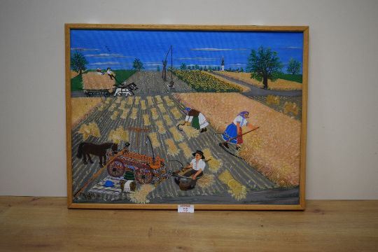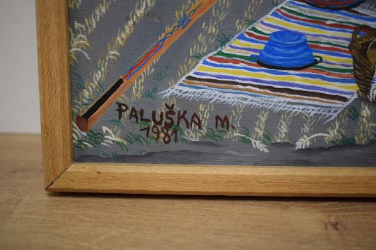 Martin Paluska (Serbian 1913 - 1984) oil on canvas, a harvest scene with villagers dressed in traditional clothing, signed and dated (1981) to lower left, within wooden tray frame, 50cm x 38cm & 52cm x 40cm overall *Paluska regularly painted his home town of Kovacica creating pieces that focused on the world of villagers , fieldwork and customs including everyday displays of folk costumes, he believed in using art as a way to preserve and record tradition for future generations.