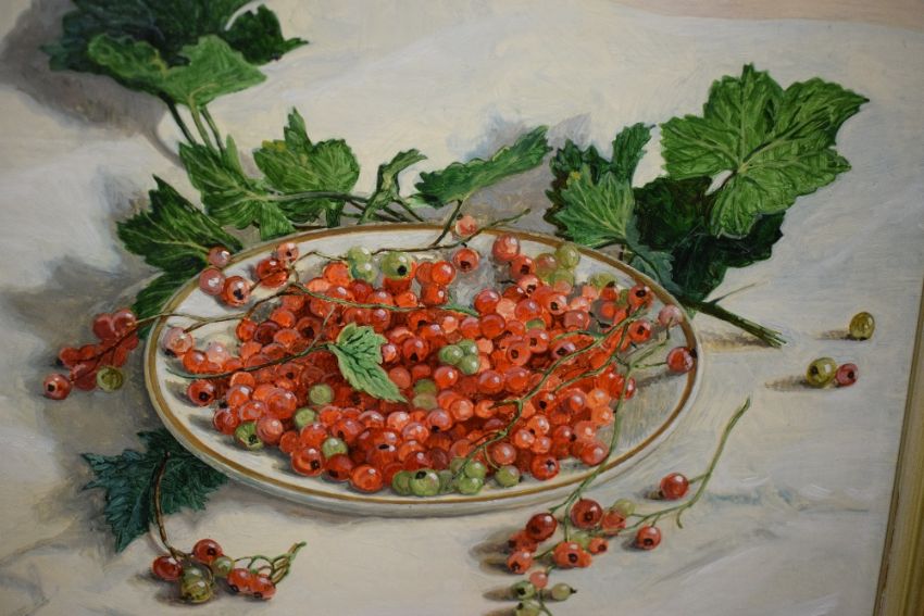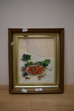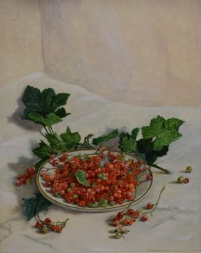 Stephen J. Darbishire (British b1940) oil on board, still life study of redcurrants, signed lower right, with dedication inscription from the artist verso, within a moulded frame 24cm x 19cm & 34cm x 29cm overall.