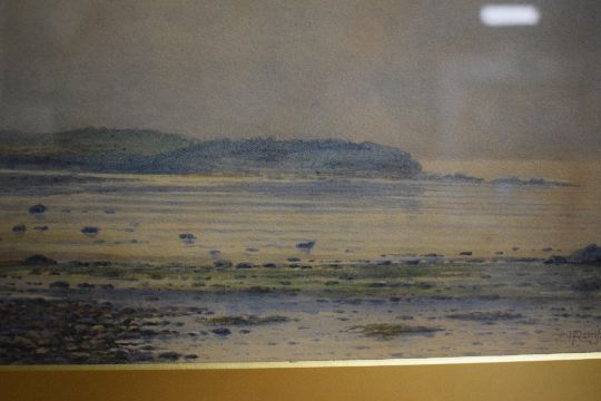 Robert Rampling (British 1836 - 1909) watercolour, a beach at low tide, signed lower right, within gilt mount and moulded gilt frame, under glass 28cm x 19cm & 42.5cm x 33.5cm overall.