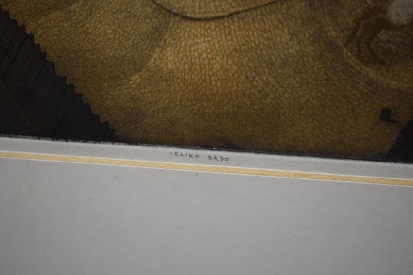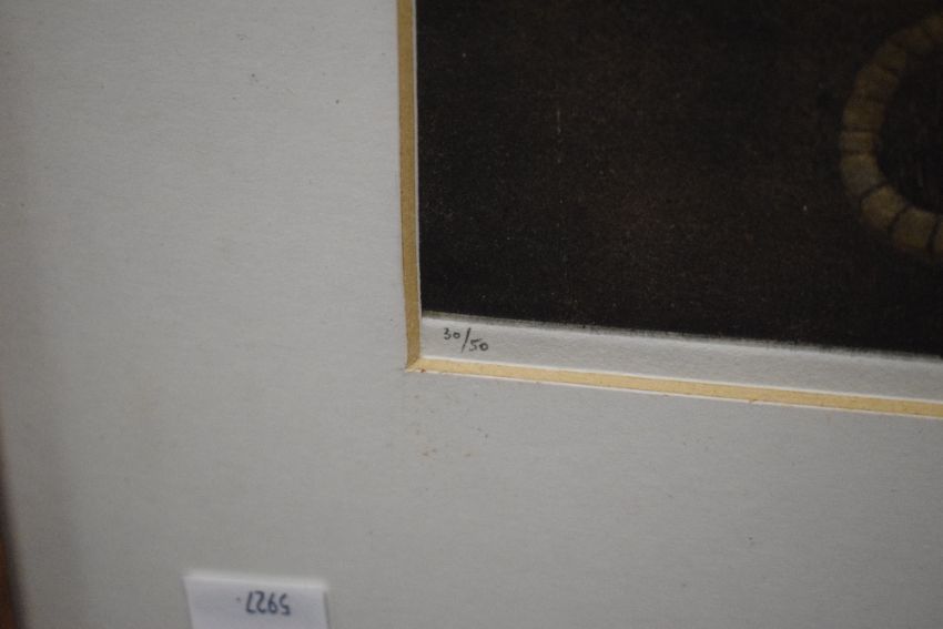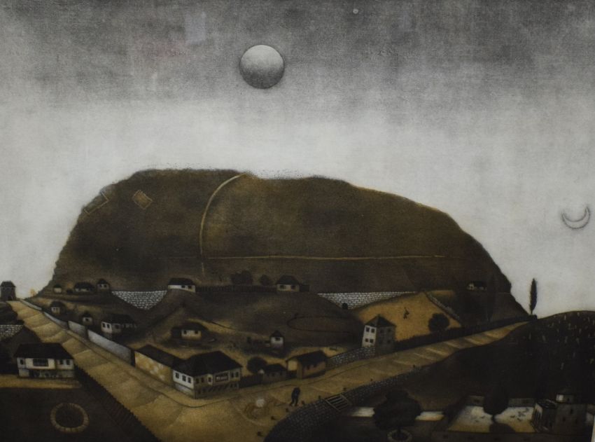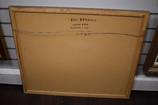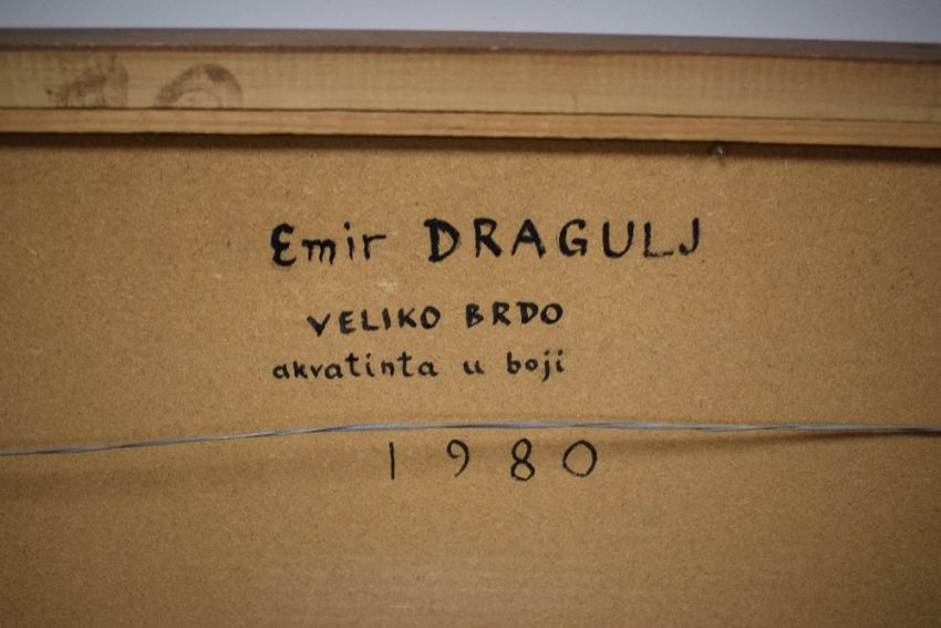 After Emir Dragulj (Bosnian 1939 - 2002) Aquatint/etching 'Veliko Brdo' an interesting scene depicting a man leading a horse through a mountainous village at night time, signed and dated (1980) in pencil to lower right margin titled centre and numbered (30/50) to left, attribution date and title verso, within card mount and flat wooden frame, under glass 63cm x 49cm & 84cm x 71cm overall.