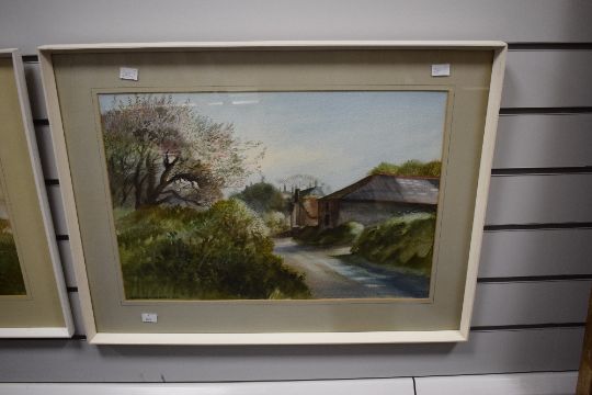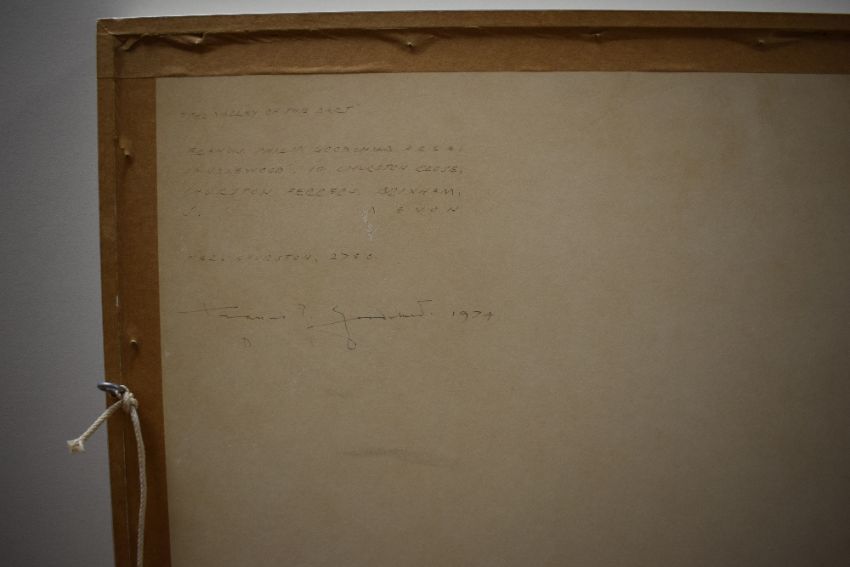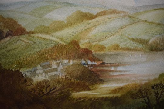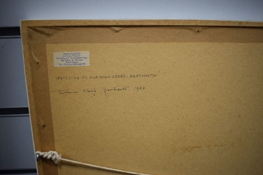 Francis Phillip Goodchild (British 1900-1986) Watercolour, 'Entrance to Old Mill Creek Dartmouth' an attractive piece depicting the estuary and village as seen from nearby hillside, signed and dated (1982) to lower left, titled and attributed in ink verso, within washline mount and white frame, under glass 53cm x 34.5cm & 68.5cm x 50.5cm overall. Sold along with two other watecolours by the same artist 'Waddeton' and 'The Valley of Dart' both signed and dated (1974) to lower left with titles and attribution verso, within washline mounts and white frames, under glass 52.5cm x 36cm & 68cm x 52cm overall.