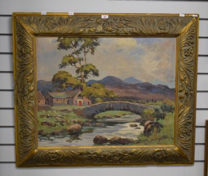 *Local Interest* James Brindle (British 1893 - 1977) oil on canvas 'Watendlath Bridge, Keswick, Cumberland, England' an impressionistic lakeland landscape capturing the small hamlet close to Borrowdale, signed lower right, entitled and attributed verso, within moulded gilt frame, 75cm x 60cm & 100cm x 84cm overall.