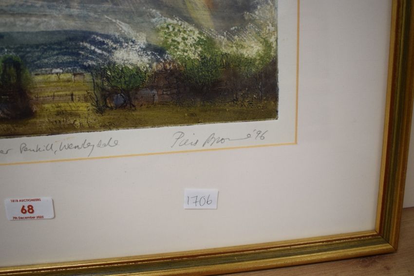 *Local Interest* After Piers Browne (British 1942 - 2024) Colourised Etching 'April Showers over Penhill, Wensleydale' a vibrant landscape, signed in pencil and dated (1996) to lower right margin titled centre and numbered (28/50) to left, artist biography verso, within card mount and moulded gilt frame, under glass 37cm x 17cm & 59cm x 40cm overall.