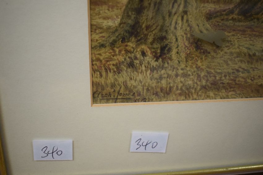 Archibald Jones (British 19th/20th century) watercolour, children playing under large trees, signed and dated 1912 lower left, within a card mount and moulded frame, under glass 26cm x 37.5cm & 42.5cm x 55cm overall.