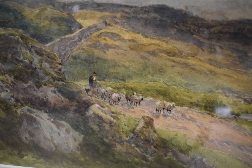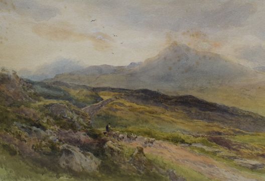 Artist Unknown (British 20th Century) English school watercolour, a British pastoral scene of a shepherd moving a flock of sheep through the hills, signed indistinctively to lower left, within washline mount and moulded gilt frame, under glass 33cm x 23cm & 53cm x 43cm overall.