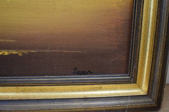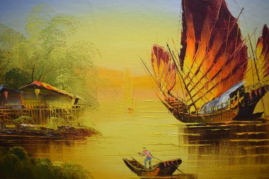 A contemporary oil on canvas, a Chinese inspired landscape with junk boats on water at sunrise/sunset, attributed to 'Susan' in pen to lower right, within moulded gilt frame, 58.5cm x 46cm & 69cm x 57cm overall.