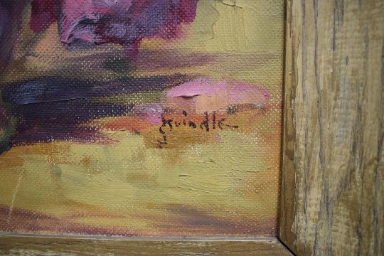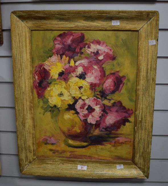 James Brindle (British 1893 - 1977) impasto oil on board, depicting a vase of flowers in pinks and yellows, signed indistinctively lower right, within moulded frame 38cm x 50cm & 51cm x 62cm overall.