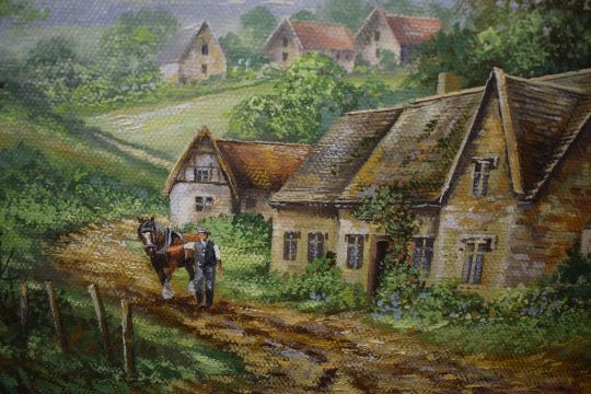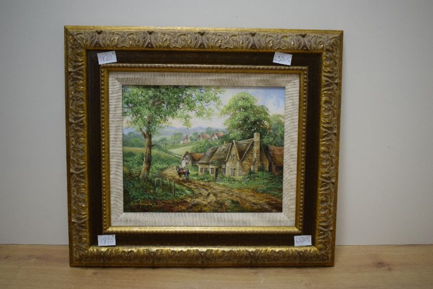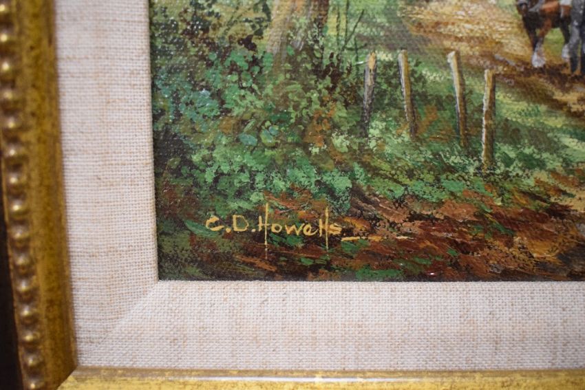 Christopher Howells (British 1947 - 2013) A pair of oils on canvas, depicting a man leading a horse up a rural dirt track with cottages and a rural hamlet of cottages, both signed lower left, within canvas slip and moulded gilt frame 24cm x 19cm & 41cm x 36cm overall