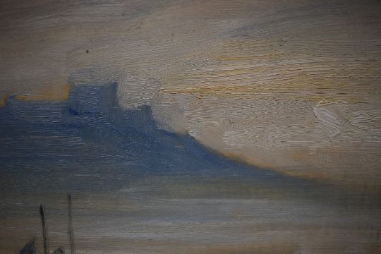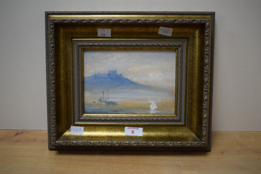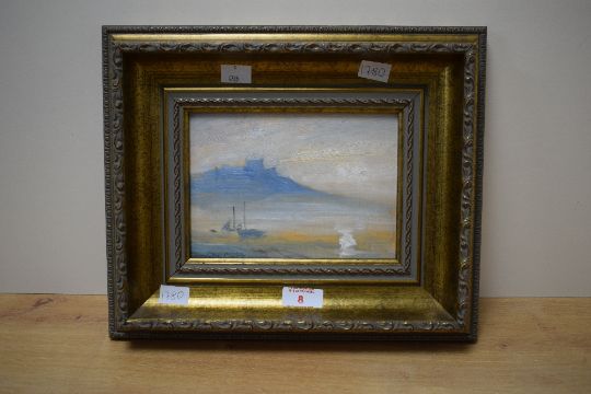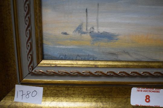 *Local Interest* John Cooke (British 1929 - 2018) oil on board, a coastal sunset with sailboats and buildings upon distant cliff, signed lower left, within moulded gilt frame 18cm x 13cm & 33cm x 28cm overall.