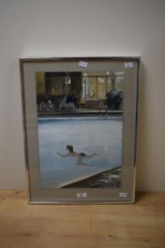 *Local Interest* John Cooke (British 1929 - 2018) Watercolour, a study of a woman swimming in an indoor pool, signed lower right, on card backboard within thin metal frame, 29cm x 16.5cm & 38.5cm x 51.5cm overall.