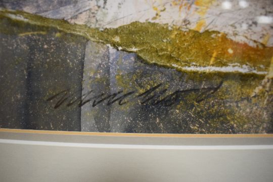 Duncan MacLeod (Scottish 1955) Mixed media 'Lochan - Under a Sultry Sky', an interesting piece of a stormy shoreline created with what appears to be layered ripped paper and watercolour, signed to lower left, titled and attributed verso, within stepped card mount and light grey and gilt frame, 44.5cm x 42cm & 78.5cm x 78.5cm overall.
