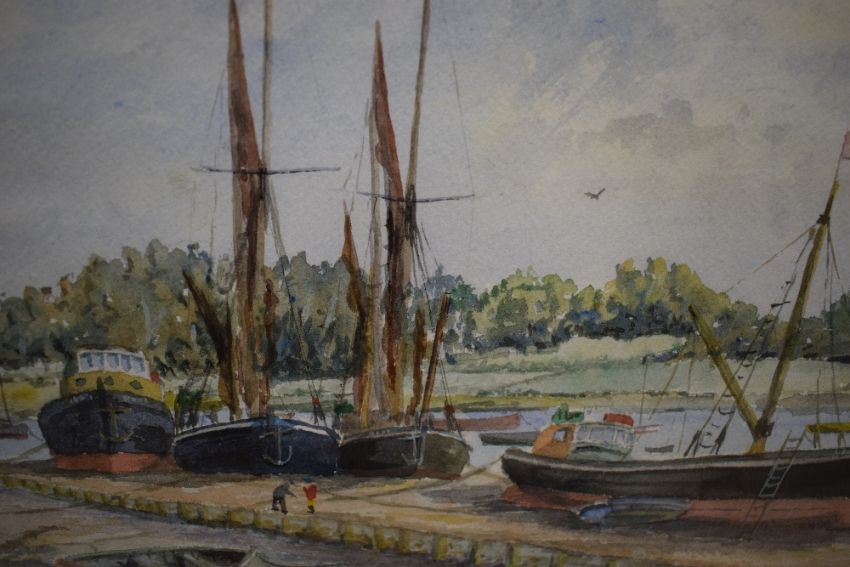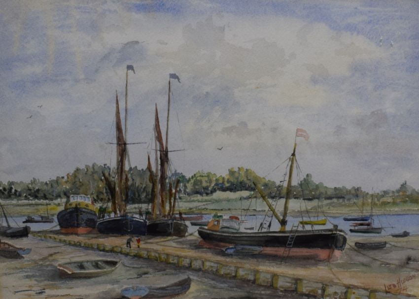 Leb Hudson (20th Century) Watercolour, depicting boats moored in an estuary notably what appears to be a pair of Thames sailing barges, signed and dated (1974) lower right, within washline mount and moulded gilt frame, under glass 33cm x 24cm & 53cm x 44cm overall.