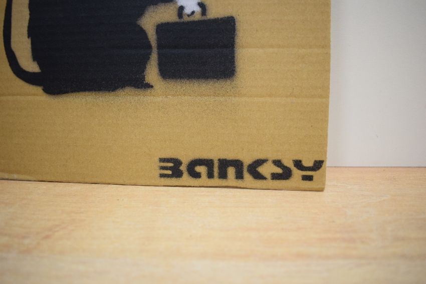 In the style of Banksy (British b.1974) limited edition graffiti stencil on cardboard 'Dismaland 2015' rat with umbrella 19/40 signed with stamp lower left and reverse unframed. 31cm x 23cm overall.