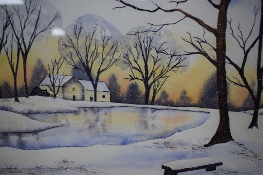 Sheila Vdall (Contemporary) Watercolour, A winter cottage scene, signed in pencil to lower right, within card mount and flat black frame, under glass 28cm x 20cm & 42.5cm x 33cm overall. Sold alongside six other watercolours by the same artist, notably a windmill scene and a two winter woodlands, all signed in pencil and framed to the same measurements as the first.