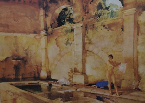 After William Russell Flint (British 1880 - 1969) a pair of coloured prints the first 'In Classic Provence' featuring two women in a bath house, the second 'The Seven Springs of Vers' featuring two women collecting water, both with printed signature to lower left, attribution and title verso, within washline mounts and moulded gilt and cream frames, under glass 38cm x 23.5cm & 57cm x 41.5cm overall.