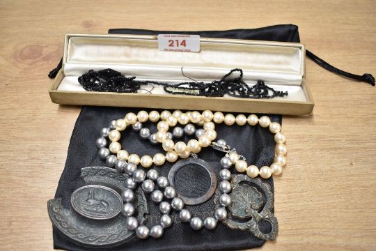 A selection of 20th-century costume jewellery, to include a Mojolica double-layered pearl necklace and a black seed bead necklace, sold with others (5), the black necklace is broken.