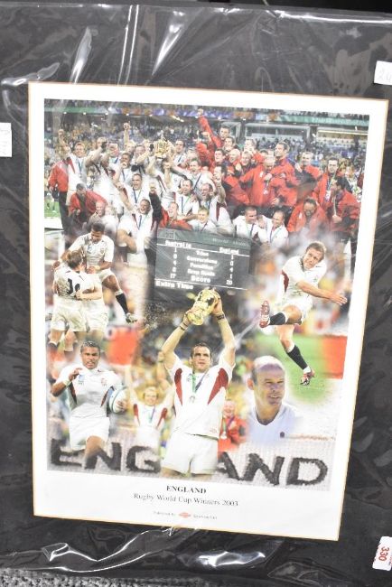 A selection of prints, England Rugby World Cup 2003 Winners Poster in black card mount 38cm x 27.5cm & 51cm x 40.5cm overall, sold together with stamp post cards on green card in pine and gilt frame 30cm x 21.5cm and 37cm x 28.5cm overall and a Latin world map on paper attached to black wooden board 54.5cm x 38cm and 58.5cm x 42cm overall, being sold for charity.