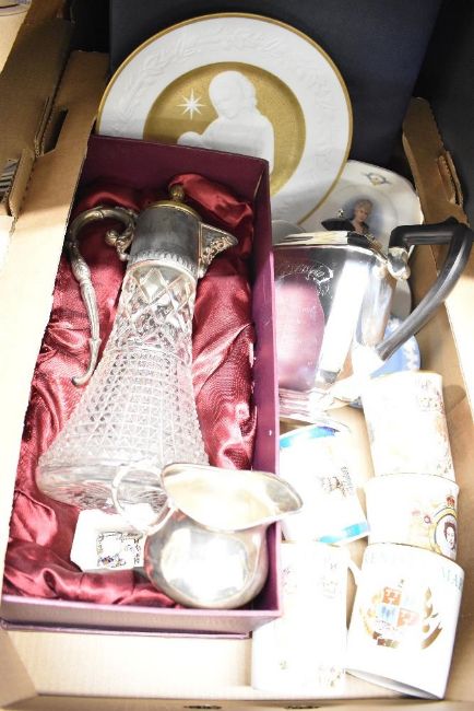 Nineteen sterling silver and enamel Kendal travel shield charms 1cm x 1.5cm, a Franklin Porcelain Christmas Eve Celebration plate entitled Silent Night in original display box, a pressed glass and silver plate claret jug, two jasper ware pin dishes and a small selection of celebration ware etc.