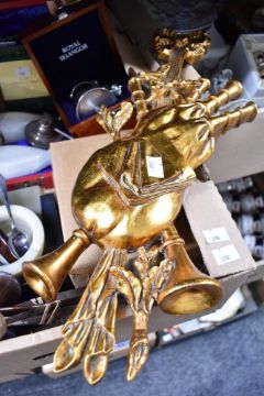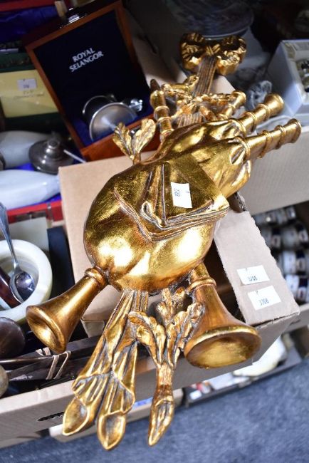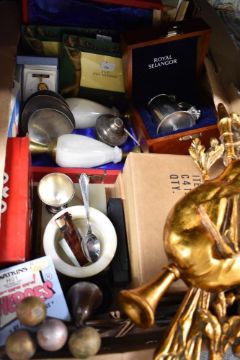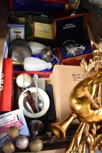 A miscellaneous selection of items including a marble cigarette box, ash tray and pair of small vases, four golf themed picture frames, a cased Royal Selangor christening mug having a teddy bear decoration to the handle, a vintage book with a small selection of hand written recipes and a wooden effect wall decoration etc.