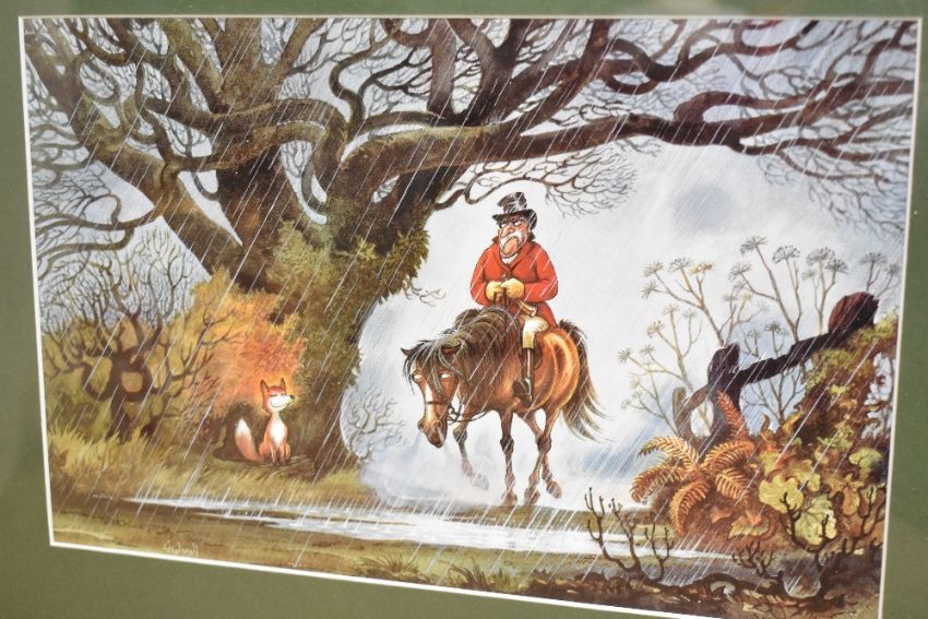 A vintage Norman Thelwell sporting print, The Return Home, framed, featuring a lighthearted and cartoonish depiction of a horse and rider in the rain, with a grinning fox seeking shelter under a tree, 37.5 cm.