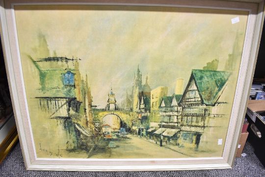 A print on board after Ben Maile depicting a busy city street framed 84cm x 66cm.
