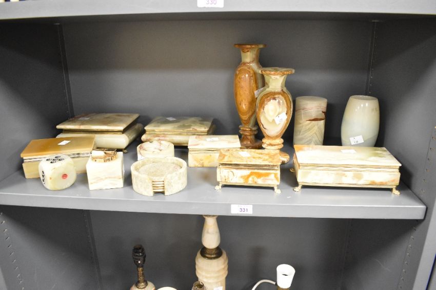 A large quantity of late 19th to 20th century Onyx, to include five ornately carved and decorated lamp bases; a selection of gilded footed boxes, some with hinged lids some without; a decorative dice; a circular ashtray; five decorative vases and more, (approximately 23 pieces), condition is consistent with age and use.