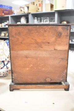 A Victorian tabletop mahogany chest of drawers, presumed apprentice piece, with a two over three drawer configuration, decorative carved columns, bracket feet to the base and a hidden drawer, currently filled with vintage sewing notions, 39cm x 36cm, condition consistent with age and use, large visible chip to top right corner, overall areas of surface wear.