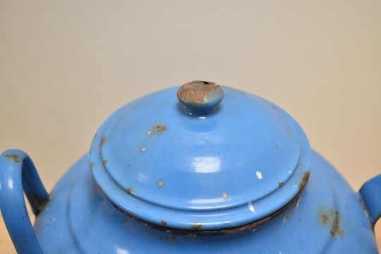 A 20th-century blue enamelware teapot, marked to base, 25cm, condition is consistent with age and use, visible signs of wear and some oxidation.