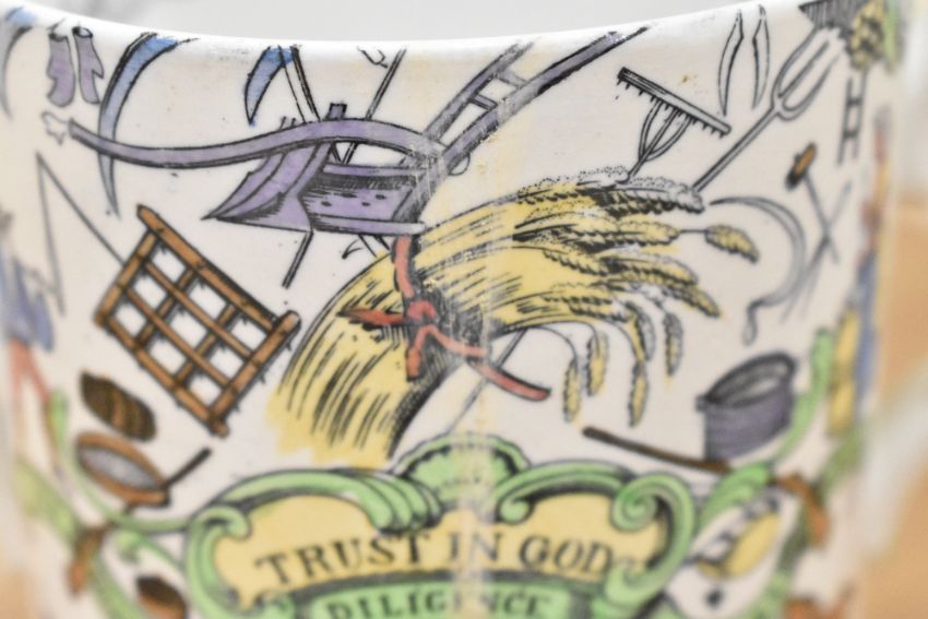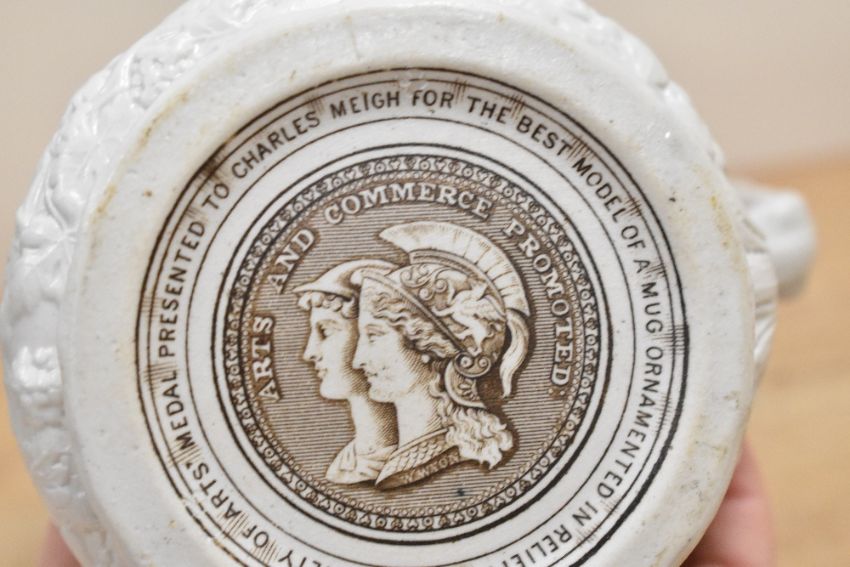A quantity of Victorian mugs/jugs, to include a Charles Meigh 'Bacchanalian Dance' parian ware jug; a hand painted Radford example; Adams Farmers Arms motto ware example and others, most marked to base but not all, (7), condition is consistent with age and use.