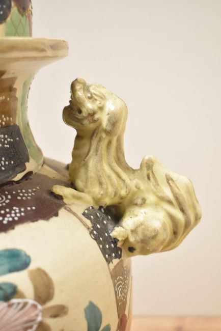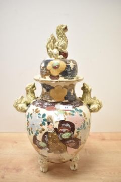 A large late 19th to 20th century Japanese Satsuma ware vase, featuring colourful hand painted decoration of traditional floral and figural scenes, with Fo dog twin handles and finial, upon three Fo dog-formed feet, marked to base, 51cm, condition is consistent with age and use, areas of surface wear to paint, no visible cracks or chips.