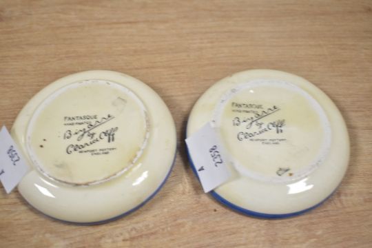 Two early 20th-century Art Deco Newport Pottery Fantasque Bizarre ware by Clarice Cliff pin trays, featuring colourful abstract decoration, marked to base, (2), condition is consistent with age and use, large chip to rim of one and surface wear to both.