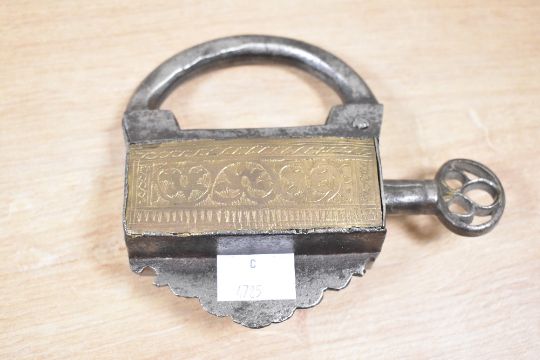 A late 19th to early 20th century Mughal iron and brass padlock, with a screw type key, of ornate decoration, unmarked, 9cm, used but working condition.