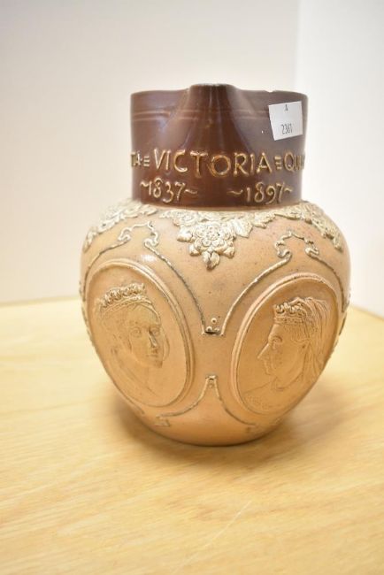 A Victorian Doulton Lambeth stoneware jug commemorating Queen Victoria's Diamond Jubilee in 1897, featuring applied relief portraits and a motto 'She brought her people lasting good'; sold with two presumed Bourne Denby hunting jugs, marked to base, (3), condition is consistent with age and use, visible chips to rim of smallest example and Queen Victoria example, fixed chip to spout of Bourne Denby and an area of presumed black paint to base of jug, overall areas of surface wear to all examples.