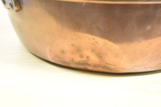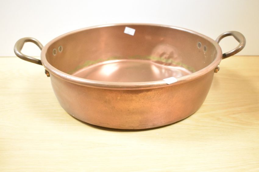 A large Victorian copper preserve pan with twin handles, 38cm, condition is consistent with age and use, visible areas of surface wear.