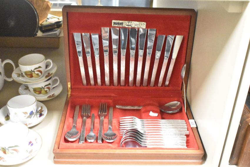 A 20th-century Viners stainless steel 'Sable' cutlery set, in its original presentation box, to include spoons, forks, and knives, all pieces marked.