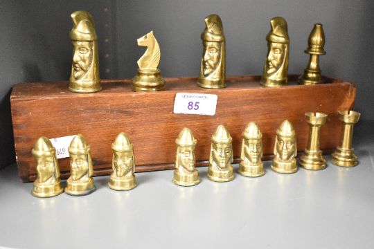 A selection of 20th-century Tigani Gothic-style brass chess pieces, with wooden storage box, (14).
