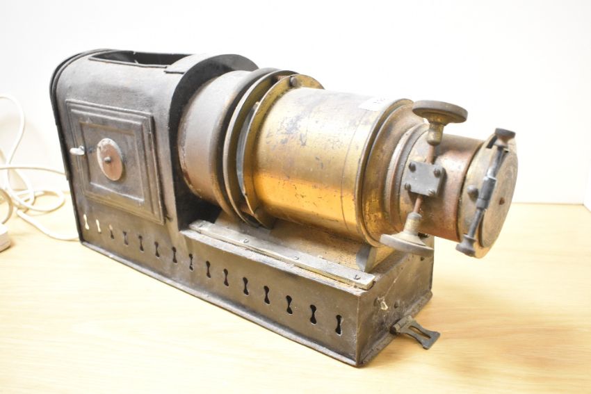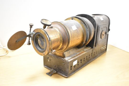 A Victorian brass and tin Magic Lantern, unmarked, 46cm, condition is consistent with age and use, with significant areas of metal ware, sold as is.