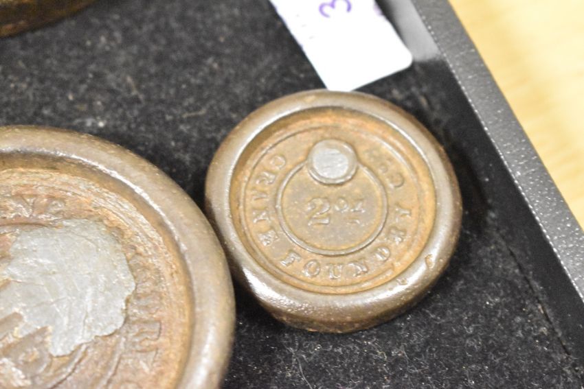 A large assortment of 20th-century iron nesting weights, to include examples from A.K and Sons, C.H Crane of Wolverhampton, W. Cross and Sons, W. Bento and Falkirk Iron Company, most marked to front, (16), condition is consistent with age and use.