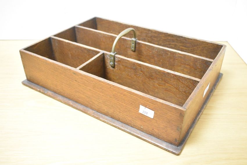 An early 20th-century Georgian-style oak cutlery tray with brass handle, featuring four compartments, 38cm x 27cm, condition is consistent with age and use.