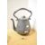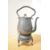 A large Victorian pewter alloy spirit kettle and stand, featuring an ornately formed handle with flower finial, having three leaf-formed feet, unmarked, 38cm, condition is consistent with age and use.