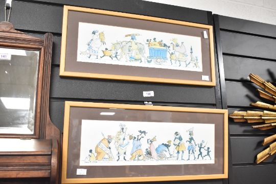 Two 20th-century South African framed prints after Lucy M. Wiles (1920-2008), featuring vibrant, narrative African village scenes of daily life, signed to bottom left corner, (2), good condition.